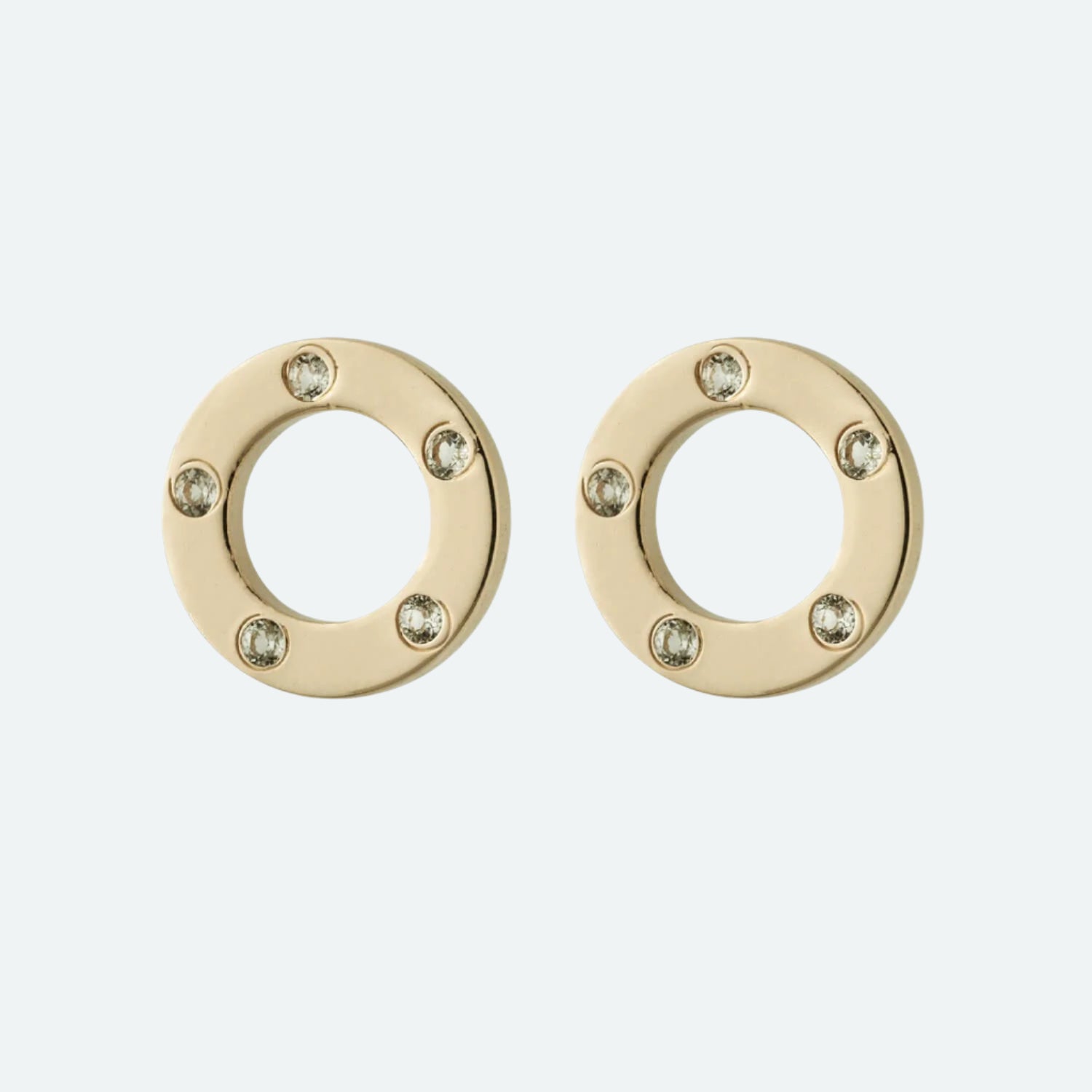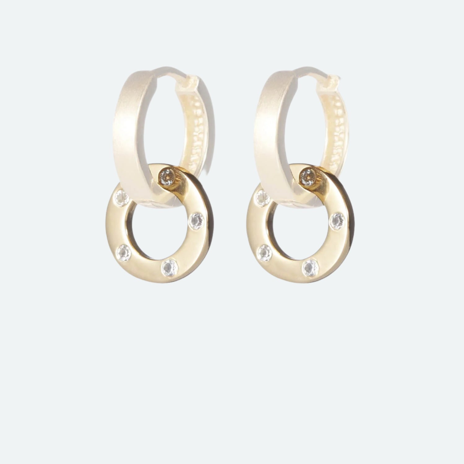 Klassisk och elegant, denna guld-livboj är en utmärkt matchning till en enkel creole eller ihopparad med ett annat hänge i en dubbel uppsättning. Med fem vita topaser och en bedårande design är det en riktig bästsäljare!