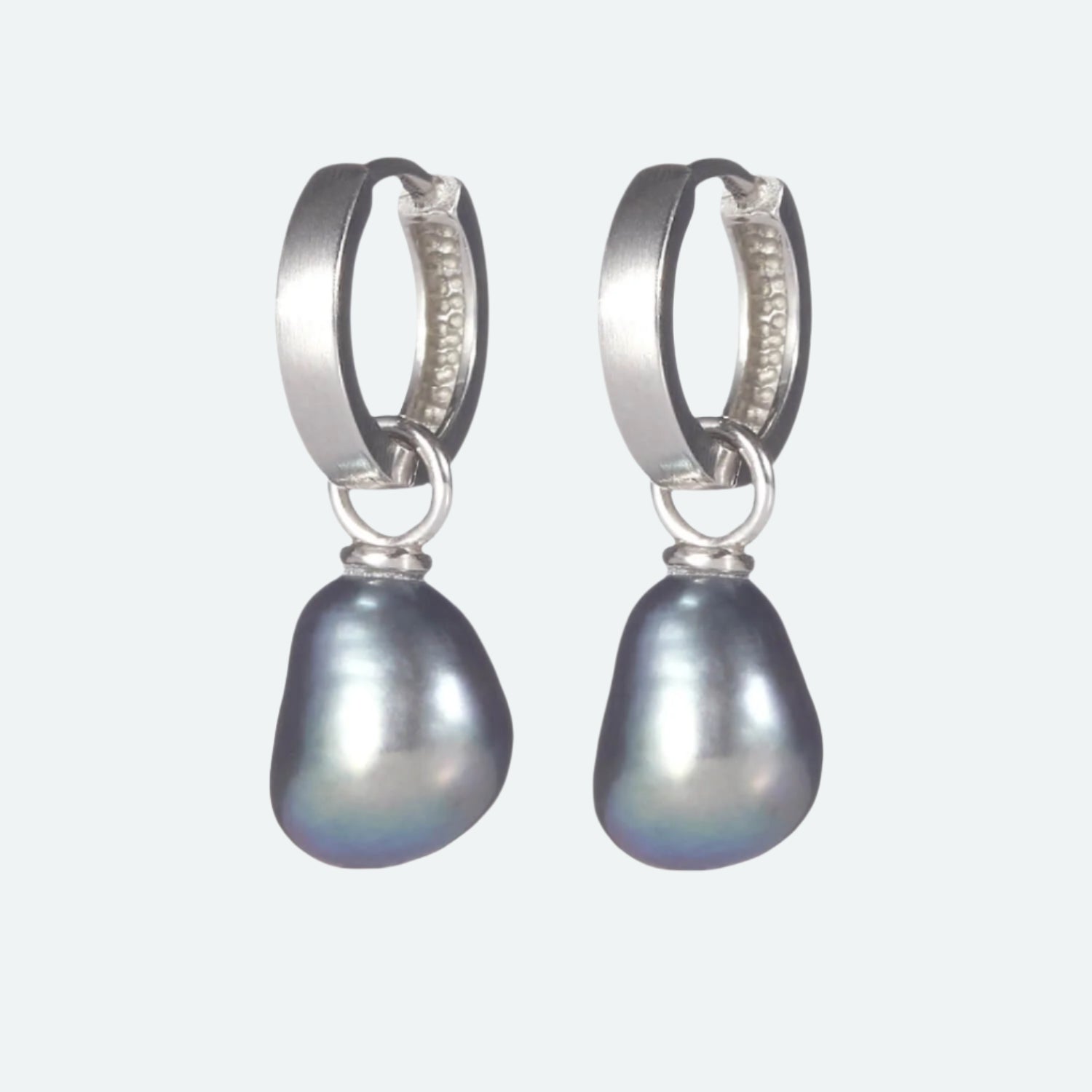 Single Set bestående av peacockfärgade och droppformade sötvattenpärlor i kombination med Classic silver creoler.